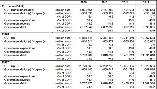 Vládní dluh v eurozóně se podle zprávy statistického úřadu Eurostat v roce 2012 vyšplhal na 90,6 % z 87,3 % v roce 2011. Údaje tak souhlasí s předběžnou zprávou zveřejněnou v dubnu letošního roku. Deficit vlád v roce 2012 klesl na 3,7 % z 4,2 % v roce 2011. V celé evropské sedmadvacítce dosáhl deficit 3,9 % z 4,4% schodku v roce 2011 a dluh se vyšplhal na 85,1 % z 82,3 % v předchozím roce.