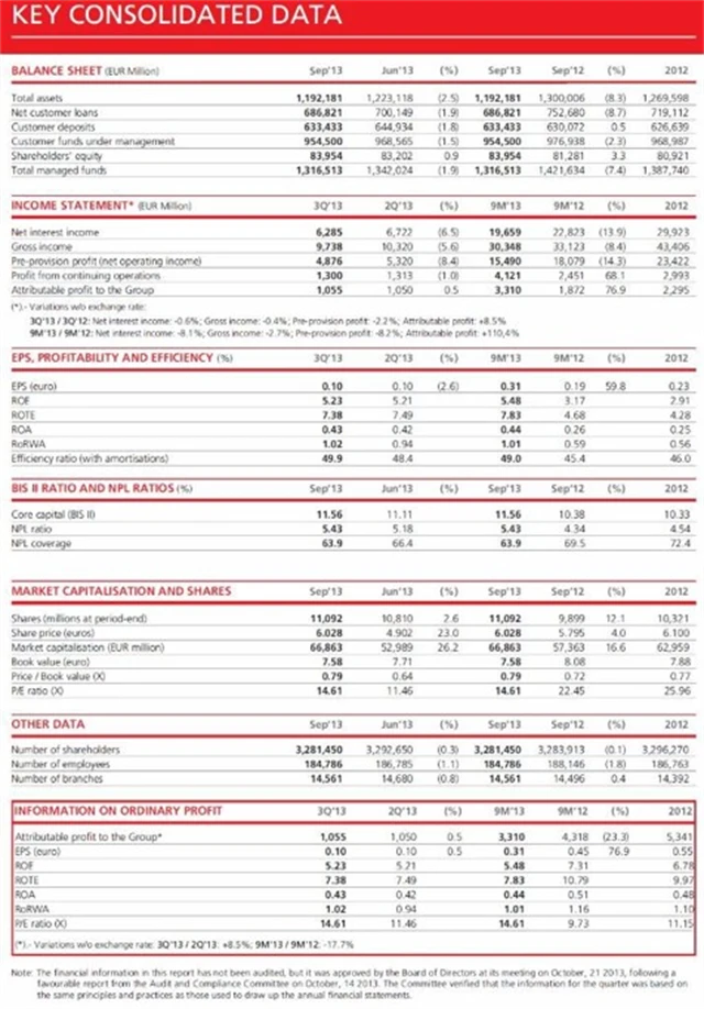 Španělské bance Santander vzrostl za prvních devět měsíců letošního roku čistý zisk o 77 % na 3,3 miliardy eur (85,1 miliardy Kč). Santander je podle tržní kapitalizace největší bankou v eurozóně a v letošním roce těží zejména z toho, že na ztrátové úvěry nemusí vydávat tolik peněz jako před rokem.