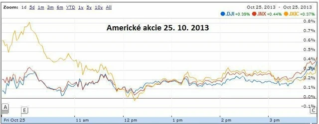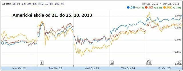 Za uplynulý týden Dow připsal 1,11 %, index S&P 500 zpevnil o 0,88 % a Nasdaq o 0,74 %. Všechny tři hlavní burzovní ukazatele od začátku roku vzrostly o více než 18 %. K jejich růstu přispívá pomalé oživování americké ekonomiky, vyšší zisky firem a pokračující měnové stimuly od americké centrální banky, které investory vybízejí k dalším nákupům. Po nedávné rozpočtové krizi se také zvýšila pravděpodobnost, že Fed tato opatření v dohledné době omezovat nebude.
