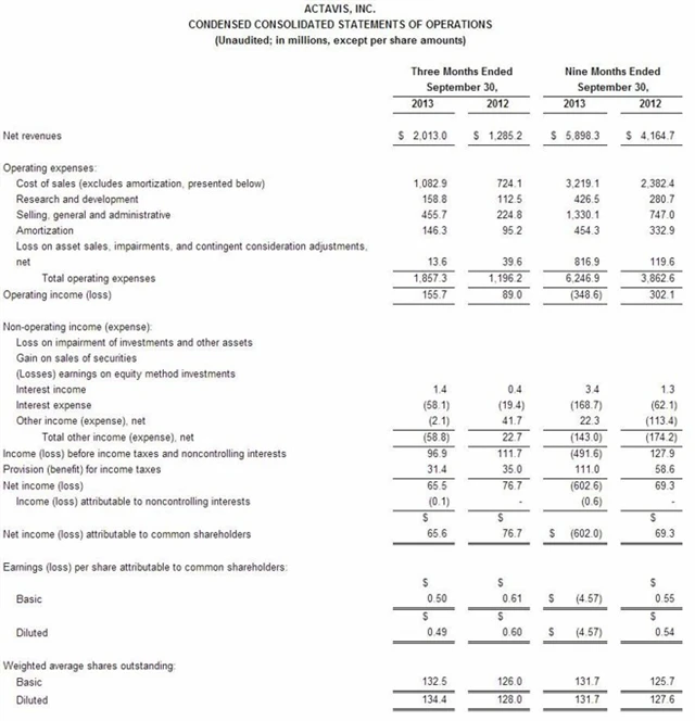 Výsledky Actavis ve 3Q2013: Zisk na akcii 2,09 USD v souladu s odhady, tržby rostou o 57 % na 2,01 miliardy USD