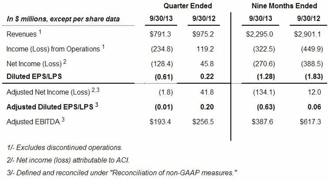Výsledky Arch Coal ve 3Q2013: Ztráta na akcii 1 cent (odhad: -31 centů), tržby 791,27 milionu USD (odhad: 887,92 milionu USD)