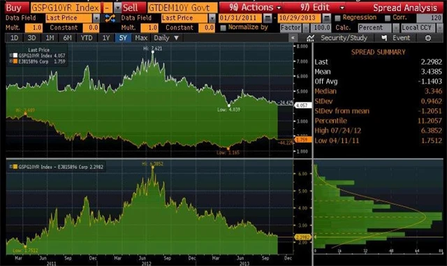 Spread mezi španělskými a německými dluhopisy se snížil na minimum od ledna 2011 Redakce IW29. 10. 2013 | 14:29ŠpanělskoZdroj: BloombergNěmecké státní dluhopisyŠpanělskoRedakce IW Další články autoraTOP 10 článků týdne: Vize Nvidie, americké akcie a víra ve zlatoOčekávané výsledky světových firem v týdnu od 3. listopadu: McDonald’s, Palantir, Ryanair, BMWTrump: Dohoda s Čínou je na světě, vzácné zeminy budeme dále řešit na roční báziDoporučujemeNestihli jste naskočit do zlaté rally? Vůbec není pozdě, říká stratégZlato Rychlé peníze ve velkém opustily zlato a stříbro. Trh se připravuje na další růstZlatoAuto jako služba: Operativní leasing stále více láká domácnostiFinanční sektor Aktualitydnes | 14:07Dálniční boom v Česku: Vzniká prostor pro nová průmyslová centra, mapa české logistiky se měnídnes | 10:55Nová starost pro trh s drahými kovy: Čína zrušila daňové zvýhodnění pro obchodníkydnes | 9:37Kolik budou v roce 2026 platit OSVČ na paušální dani?31. 10. | 21:30Závěr týdne se na amerických burzách vydařil. Investoři sčítají zisky za pátek, týden i celý měsíc31. 10. | 18:00Evropské akciové indexy v pátek klesly. V týdenním horizontu se na směru neshodly, říjen už ale pro ně byl ziskový31. 10. | 16:53Akcie Redditu zdražily po výsledcích výrazně nad odhady31. 10. | 16:45Pražská burza v pátek posílila, skoro 5% zpevnění akcií Erste postrčilo index PX na nové maximum31. 10. | 16:16Akcie Luminar Technologies se zřítily po varování před nedostatkem hotovosti31. 10. | 16:06Indie obnovila nákupy ruské ropy od dodavatelů mimo sankční seznam31. 10. | 15:26Standard Chartered: Hodnota tokenizovaných aktiv do roku 2028 vzroste na 2 biliony dolarů31. 10. | 15:06Akcie Getty Images posilují přes 20 % po uzavření licenční dohody s Perplexity AI31. 10. | 14:50USA: Index podnikatelské aktivity v oblasti Chicaga v říjnu vzrostlZobrazit všechny aktuality Nejčtenější tento týden1.Nestihli jste naskočit do zlaté rally? Vůbec není pozdě, říká stratég2.Rychlé peníze ve velkém opustily zlato a stříbro. Trh se připravuje na další růst3.Auto jako služba: Operativní leasing stále více láká domácnosti4.Čtyři důvody, proč po korekci nakupovat akcie evropských zbrojovek5.Modlitba pasivního investora a jak podle expertů (ne)investovat v celní bouři6.Buffettův odkaz: Trpělivost jako klíč k investičnímu úspěchu Sledujte násinvesticniweb.cz14000Investiční web19300LIVE2300Investiční web1000investicni_web500Investicniweb.cz33600