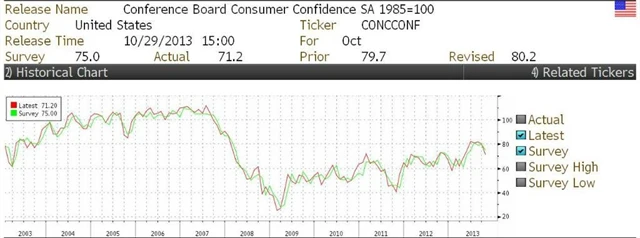 Index spotřebitelské důvěry v USA za říjen nečekaně klesl ze 79,7 bodu na 71,2 bodu (odhad: 75 bodů, revize: 80,2 bodu) Redakce IW29. 10. 2013 | 15:00Americká ekonomikaZdroj: BloombergAmerická ekonomikaSpotřebitelská důvěraRedakce IW Další články autoraJak vydělat na jednorožcích dříve, než se na ně vrhnou investoři na burzeAkciový býk pádí vyspělými trhy. A není to jen americké témaTOP 10 článků týdne: Vize Nvidie, americké akcie a víra ve zlato DoporučujemeNestihli jste naskočit do zlaté rally? Vůbec není pozdě, říká stratégZlatoRychlé peníze ve velkém opustily zlato a stříbro. Trh se připravuje na další růstZlatoPříští vláda shrábne makroekonomický jackpotČeská ekonomika Aktualitydnes | 13:32Akcie Arm posilují, silná poptávka po AI žene zisky i výhled nad očekávánídnes | 13:25Americký akciový trh nepraská, jen se ohýbá. Stále je co a proč nakupovat, říká expertdnes | 13:13Futures na americké akcie: Dow +0,03 %, S&P 500 +0,16 %, Nasdaq 100 +0,15 %dnes | 13:02Britská centrální banka nechala základní úrokovou sazbu na 4 %dnes | 13:00Maloobchod v eurozóně v září stagnoval, růst držely jen Německo a Španělskodnes | 12:52Akcionáři Tesly dnes rozhodnou o rekordní odměně pro Elona Muskadnes | 12:45PMI ve stavebnictví ve Spojeném království klesl na 44,1 bodudnes | 12:42PMI ve stavebnictví v Itálii vzrostl na 50,7 bodudnes | 12:36PMI ve stavebnictví v Německu klesl na 42,8 bodudnes | 12:30PMI ve stavebnictví ve Francii klesl na 39,8 bodudnes | 12:23PMI ve stavebnictví v eurozóně klesl na 44 bodů, sektor dál ztrácí dynamikudnes | 12:17Nezaměstnanost ve Švýcarsku v říjnu stoupla na 2,9 %, nejvýše od březnaZobrazit všechny aktuality Nejčtenější tento týden1.Nestihli jste naskočit do zlaté rally? Vůbec není pozdě, říká stratég2.Rychlé peníze ve velkém opustily zlato a stříbro. Trh se připravuje na další růst3.Příští vláda shrábne makroekonomický jackpot4.Auto jako služba: Operativní leasing stále více láká domácnosti5.Dvě fakta o velkých akciových propadech, která vás možná překvapí6.Bank of America varuje: Americké akcie působí zdravě, ale trh uvnitř hnije Sledujte násinvesticniweb.cz14000Investiční web19300LIVE2300Investiční web1000investicni_web500Investicniweb.cz33600