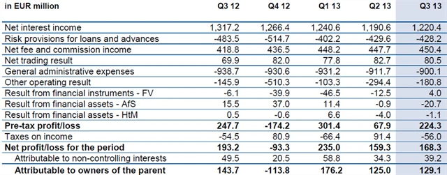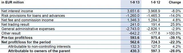 Čistý úrokový výnos se oproti loňskému roku ve stejném období snížil na 3,6516 miliardy eur (loni 3,9689 miliardy eur) kvůli stále slabé poptávce po úvěrech a nízkým tržním úrokovým sazbám. Ve třetím kvartálu byl čistý zisk mírně za odhady analytiků, úrokový výnos naopak mírně pozitivně překvapil.