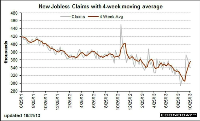 Čtyřtýdenní průměr, který je méně volatilním ukazatelem vzrostl na 356 250 z 348 250. Na konci září, před shutdownem vlády, byl průměr na 305 tisících, politická krize ve Spojených státech se tedy na zaměstnanosti Američanů projevila. Počet pokračujících žádostí o podporu v nezaměstnanosti v týdnu do 19. října vzrostl o 31 tisíc na 2,88 milionu.