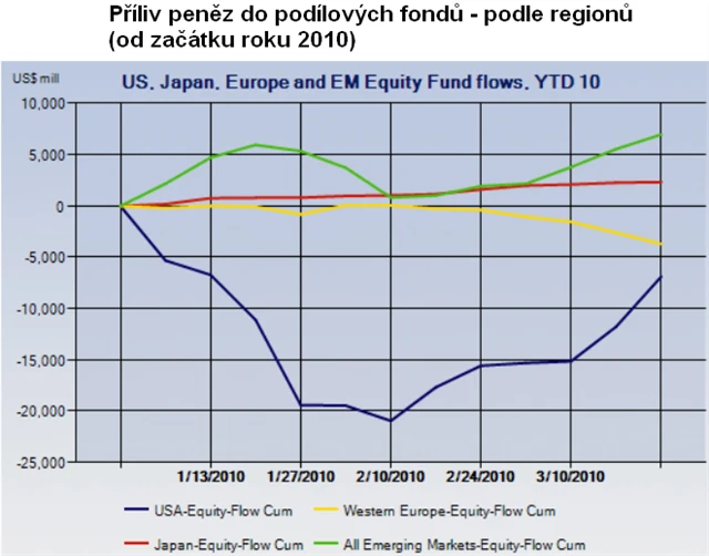 Velké nárůsty hlásily také fondy, které investují do mladých trhů, kam se řadí také Česká republika.(pozn. statistiku přílivu peněz do českých podílových fondů zveřejní Asociace pro kapitálový trh až na konci dubna)