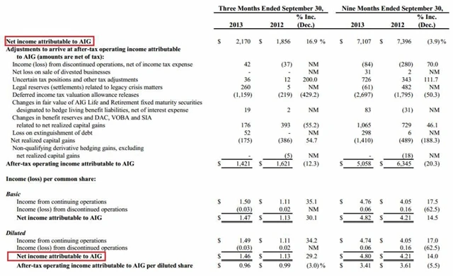Pojišťovna AIG vykázala za třetí čtvrtletí čistý zisk 2,2 miliardy USD neboli 1,46 USD na akcii (odhad: 0,96 USD na akcii, loni: 1,13 USD na akcii) při tržbách 8,43 miliardy USD (odhad: 8,63 miliardy USD, loni: 8,75 miliardy USD). Firma uvedla, že k růstu čistého zisku přispěl zejména silný růst v divizích majetkového a úrazového pojištění. Provozní zisk na akcii dosáhl 0,96 USD (odhad: 0,94 USD). Akcie AIG v after-marketu v reakci na výsledky oslabovaly o více než 2 %.