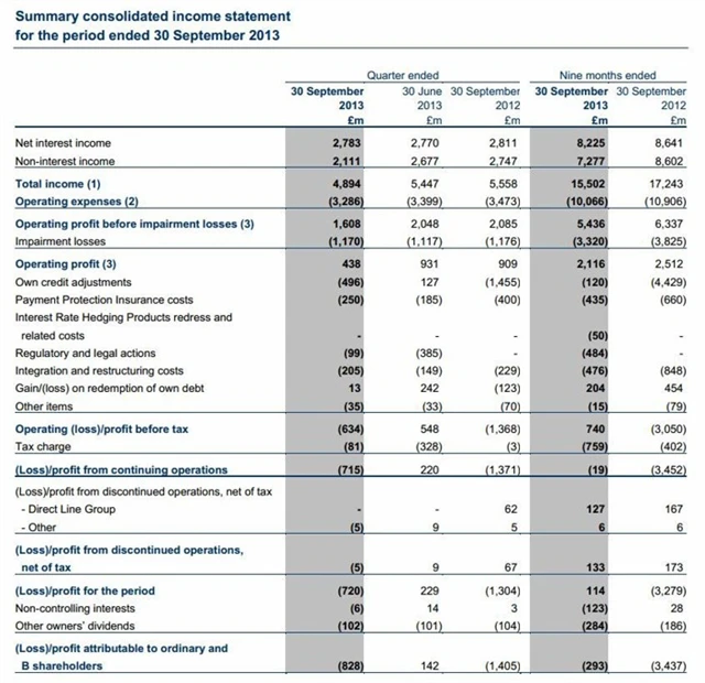 Výsledky Royal Bank of Scotland ve 3Q2013: Ztráta na akcii 0,002 GBP (odhad: zisk na akcii: 0,054 GBP), výnosy 4,894 miliardy GBP (odhad: 4,954 miliardy GBP)