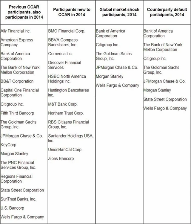 18 bank se již testů zúčastnilo, 12 je nových. Všech 30 firem musí své plány správy kapitálu dodat do 6. ledna 2014. Fed bude testovat odolnost bank například v situaci, kdy by míra nezaměstnanosti vzrostla o 4 procentní body, akciový trh by ztratil polovinu hodnoty a ceny domů klesly o 25 %. Navrhované testy jsou podobné jako ty před rokem, ale zahrnují prudší pokles cen realit a turbulence naemerging markets.