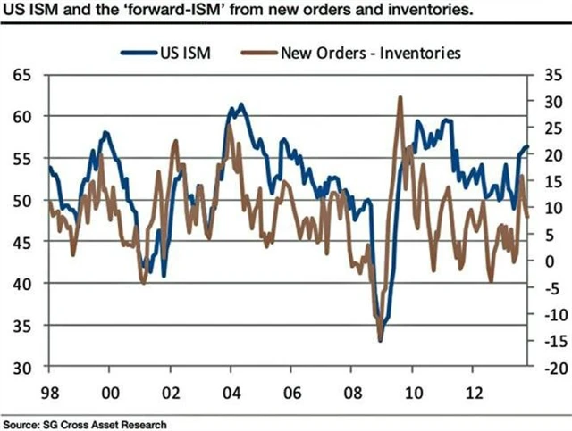 Kit Juckes ze Société Générale však varuje před přílišným optimismem ohledně tohoto indikátoru. "Když od nových objednávek odečtete zásoby (obojí má svůj subindex v rámci ISM), dostanete v podstatě výhled dalšího vývoje celkového indexu. A situace pak nevypadá až tak růžově."