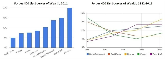 Podle magazínu Forbes je v posledních letech jednoznačným favoritem nejbohatších Američanů finanční sektor, který se na jejich bohatství podílí přibližně z 20 %. Druhé místo a podíl 16 % patří technologickému odvětví a rizikovým investicím (tzv. venture capital – pozn. red.) a bronzovou příčku již několik let drží maloobchod a gastronomie s podílem 15 %. Na opačném konci žebříčku se naopak již více než deset let nacházejí energetika (10 %) a realitní sektor (8 %).