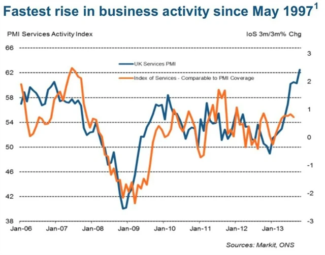 Průzkum ukázal, že firmy najímaly nové zaměstnance nejrychlejším tempem od roku 1997. Širší index zaměstnanosti, který zahrnuje i firmy ze zpracovatelského sektoru a stavebnictví, je pak nejvýše od ledna 1998. Index nových zakázek ve službách vystoupil na nejvyšší hodnotu od července 1996.