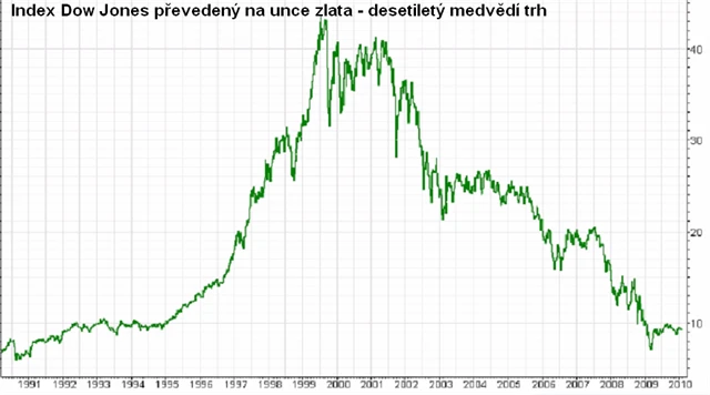 Do většinového názoru se dostává povědomí, že krize skončila s odvoláním na současný 4% růst HDP a zvyšování výrobní produkce v USA. Náš názor je takový, že růstový trh trvající desítky let skončil v roce 2000 a již desátým rokem klesáme. Když se podíváme na kurzy akcií od roku 2004, tak sice prudce vystřelily nahoru, ovšem měřeno jen americkým dolarem. Změříme-li vývoj akciových indexů něčím "reálným", například zlatem, zjistíme, že žádný býčí trh nenastal.