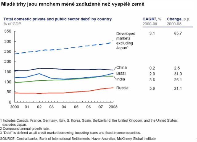 Týkají se samozřejmě hlavně rozvinutých ekonomik. Je důležité si uvědomit, že v některých zemích tyto problémy vůbec neexistují. Podíváme-li se na růst dluhu vůči HDP v Číně, Brazílii, Indii nebo Rusku, jsou na podstatně nižší úrovni. Když to zjednodušíme, vyspělé trhy jsou předluženy, protože nemají na to, co spotřebovávají. V rozvíjejících se zemích si na svoji spotřebu vydělají. Skromný život je vede k rovnováze, případně i k přebytkům. Zde je vysoký potenciál růstu.