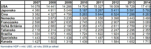 Nominální HDP v Číně již v roce 2007 převýšil HDP Německa. Letos předpokládáme, že toto číslo bude vyšší než v Japonsku. Vzhledem k rychlosti růstu nelze vyloučit možnost, že Čína v následujících desetiletích "pokoří" USA. Čínský průmysl pracuje "na plné obrátky". Například minulý rok se prodalo v Číně více aut než ve Spojených Státech. Extrémní růst tam také zaznamenává stavební produkce, s čímž je spojen prudký růst cen nemovitostí, především v Pekingu a Šanghaji. Tento "boom" vyžaduje neustálý přísun surovin a má za následek zvyšování objemu úvěrů. Samozřejmě panují obavy z vytvoření "bubliny".