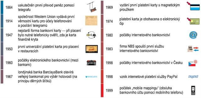 Elektronické platby ale nejsou takovou novinkou, jak by se mohlo někomu zdát. Zlatá horečka v USA v 19. století vedla k rozvoji převodů peněz na dálku (telegraficky), postupně začaly vznikat cestovní šeky a poštovní poukázky. K platebním kartám pak zbývalo ještě několik kroků - obchodníci pochopili, že je pro ně výhodné nechat spotřebitele nakupovat "jen" na základě dokladu s důvěrou v to, že banka ze spotřebitelova účtu následně platbu opravdu uhradí.