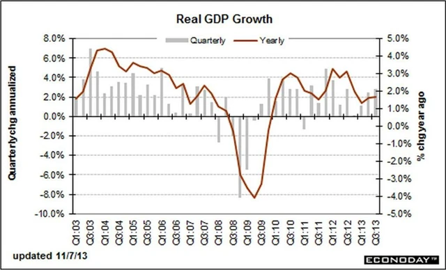 Analytici očekávali, že ekonomika ve třetím čtvrtletí zpomalila růst na +2 % ze 2,5 % ve druhém kvartálu kvůli částečnému přerušení činnosti vlády, které mělo na tempo růstu vliv. Analytici také předvídali, že osobní spotřeba, která do HDP přispívá z téměř 70 %, bude nejslabší za poslední dva roky. Ekonomika však nečekaně expandovala tempem 2,8 %. Růst HDP však táhl především růst podnikových zásob, osobní spotřeba mírně zvolnila na 1,5 % z 1,8 %.