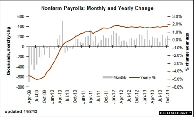 Analytici očekávali, že v říjnu přibude 120 tisíc pracovních míst, ekonomika jich vytvořila 204 tisíc. Zářijový údaj byl revidován na 163 tisíc ze 148 tisíc. Soukromý sektor měl podle predikcí zaměstnat 125 tisíc lidí, přibylo jich však 212 tisíc (září revidováno na 150 tisíc ze 126 tisíc). Průměrná hodinová mzda vzrostla o 0,1 % (odhad: +0,2 %). Celková míra nezaměstnanosti však vzrostla v souladu s očekáváním na 7,3 % ze zářijových 7,2 % a míra participace 62,8 % je nejnižší od března 1978 (v září 63,2 %).