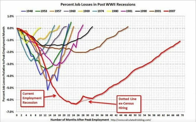 Podle serveru Calculated Risk však trh práce v USA zůstává slabý a v nejhorší kondici ze všech recesí po druhé světové válce. Následující graf ukazuje procentuální ztrátu pracovních míst od začátku recese a počet měsíců, které trvalo trhu práce se znovu dostat na původní hladinu. Křivka poslední krize z roku 2007 ukazuje, že se trh práce propadl nejhůře a kvůli rozsáhlosti nemovitostní a finanční krize se stále plně nezregeneroval.