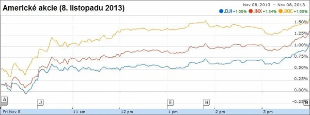 Dow vzrostl o 1,08 % a uzavřel na 15 761,78 bodu, což je nová nejvyšší závěrečná hodnota v historii. Širší index S&P 500 si připsal 1,34 % na 1 770,61 bodu, index technologického trhu Nasdaq vzrostl o 1,60 % na 3 919,23 bodu.