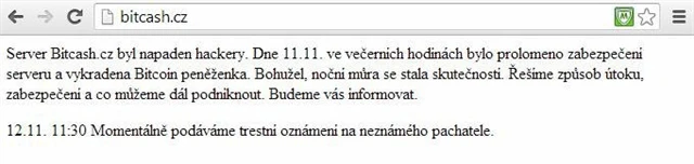 Na stránkách Bitcash.cz se objevila tato zpráva:
