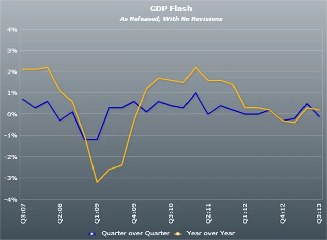 Francouzská ekonomika v letošním třetím čtvrtletí překvapivě klesla o 0,1 %, zatímco v předchozích třech měsících vykázala 0,5% růst. Vyplývá to z údajů tamního statistického úřadu. Analytici v anketě agentury Reuters počítali s nárůstem o 0,1 %. Meziročně ekonomika i tak podle předběžného odhadu povyrostla o 0,2 %. Francouzská vláda v září zhoršila odhad celoročního hospodářského růstu na 0,9 % z dříve předpokládaných 1,2 %.