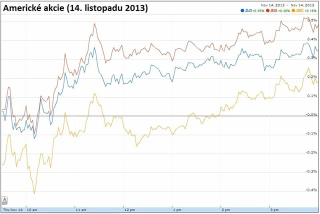 Americké akcie ve čtvrtek pokračovaly v růstu a index S&P během dne stanovil nové historické maximum 1 790,73 bodu. Trhy podpořilo vystoupení kandidátky na šéfku americké centrální banky Janet Yellenové, která předstoupila před bankovní výbor Senátu a zopakovala, že Fed pod jejím případným vedením bude ještě dlouho pokračovat v uvolněné měnové politice. Černou ovcí se stal technologický sektor, který oslabil pod tíhou cenných papírů společnosti Cisco Systems.