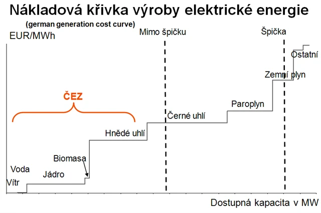 Zajímavý obrázek, jak se ČEZu dotkla, resp. nedotkla krize, přináší tento graf (viz. cost generation curve). Elektřina z větrných elektráren má nejnižší náklady, ale její nabídka je minimální. Podobné je to u vodních elektráren. Potom na grafu vidíme nabídku z atomových elektráren (což odpovídá portfoliu ČEZu) a nabídku z uhelných elektráren. V noci jedou především elektrárny jaderné a uhelné. Cenu elektřiny pak zjednodušeně řečeno vytváří cena uhlí a emisních povolenek. Ráno se k nim přidají paroplynové zdroje na zemní plyn. V krizi se v tomto oceňovacím modelu ale nic nestalo, stále jednou uhelné elektrárny v noci a plynové ve dne. A ČEZ má unikátní "portfolio", kdy, jak je dobře vidět, máme vždy zisk, protože máme nízké variabilní náklady.