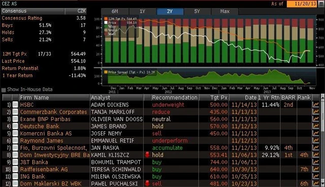 Přehled doporučení na ČEZ sebraný agenturou Bloomberg: