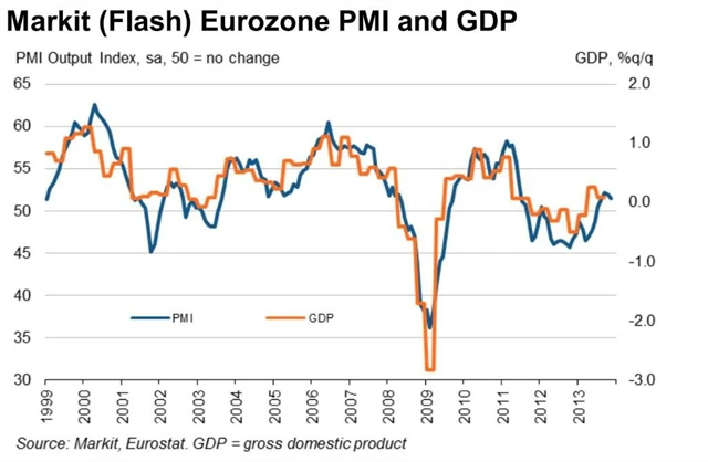 Výsledky průzkumu u nákupních manažerů potvrdily nerovnoměrné oživování eurozóny z recese. Z ní táhne blok především Německo, zatímco zbytek měnové unie zápasí o udržení růstu a nejslabším článkem je aktuálně Francie. Zatímco souhrnný index pro Francii sestoupil na pětiměsíční minimum 48,5 bodu, ukazatel pro Německo se zvýšil o více než jeden bod na 54,3 bodu.