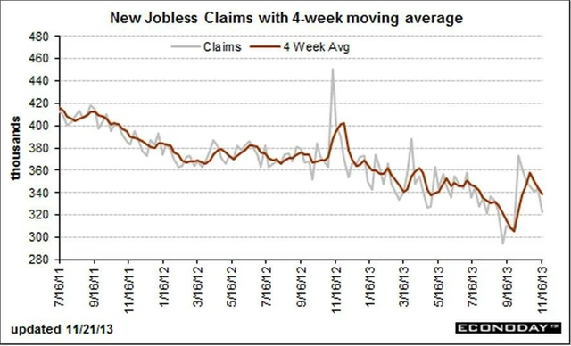 Nových žádostí o podporu v nezaměstnanosti v týdnu do 16. listopadu ubylo mnohem více, než se čekalo. Jejich počet klesl o 21 tisíc na 323 tisíc, čekal se přitom mírnější pokles na 335 tisíc. Předchozí týden byl revidován z 339 tisíc na 334 tisíc. Čtyřtýdenní průměr klesl o 6 500 na 338 500 (předchozí údaj revidován na 345 250 z 344 tisíc) a pokračující žádosti v týdnu do 9. listopadu vzrostly na 2,876 milionu z 2,810 milionu (revidováno z 2,874 milionu).