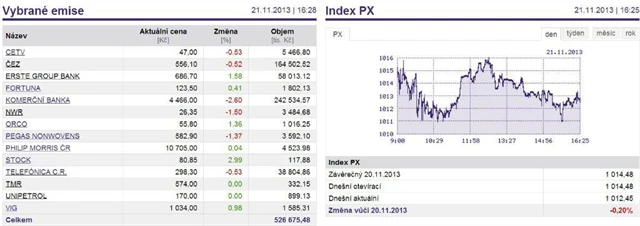 Nedařilo se především akciím Komerční banky, která byla nejobchodovanější emisí na burze a zlevnila o 2,60 % na 4 466 Kč. Ztrácela však i těžařská NWR (-1,50 %) a po zveřejnění výsledků za třetí čtvrtletí i znojemská firma Pegas Nonwovens (-1,37 %). Ve třetím čtvrtletí vzrostly tržby mírně na 47,9 milionu EUR (+0,1 % meziročně), zisk EBITDA ale výrazně klesl o 22,2 % na 8,8 milionu EUR. Dokonce i pesimistické odhady mluvily jen o poklesu o zhruba 18 %. Čistý zisk dosáhl 2,3 milionu EUR.