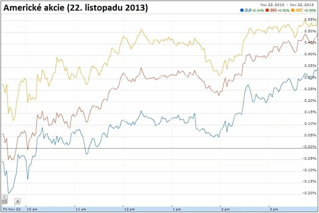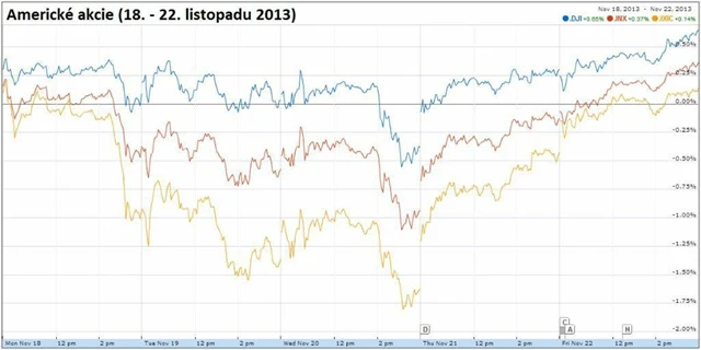 Dow za celý týden od 18. do 22. listopadu přidal 0,65 % a prodloužil svoji růstovou sérii na sedm týdnů v řadě. Širší index S&P 500 si za celý týden připsal 0,37 % a také prodloužil svoji růstovou sérii na sedm týdnů. Technologický Nasdaq vzrostl o 0,14 %. Dow navíc již ve čtvrtek uzavřel poprvé v historii nad psychologickou hranicí 16 000 bodů (16 009,99 bodu). S&P 500 pak nad psychologickou hranicí 1 800 bodů uzavřel poprvé v historii v pátek (1 804,76 bodu).
