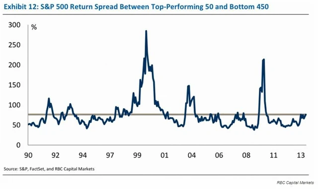 Jonathan Golub z RBC Capital Markets ukazuje ve své poslední analýze zajímavý graf, který ukazuje rozdíly mezi zhodnocením 50 nejvýkonnějších akcií z indexu S&P 500 a zbývajícími 450 akciemi: