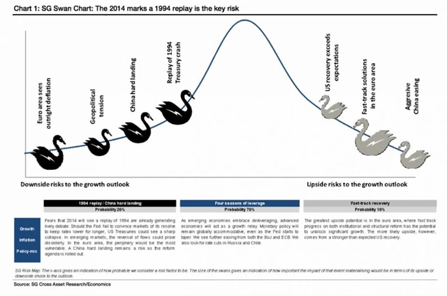 Société Générale každé tři měsíce publikuje graf černých labutí, který zobrazuje výhled rizik této francouzské banky. Černé labutě jsou události, které jsou sice nepravděpodobné, nicméně dokáží pořádně zamávat trhy a rozkolísat ekonomiku.