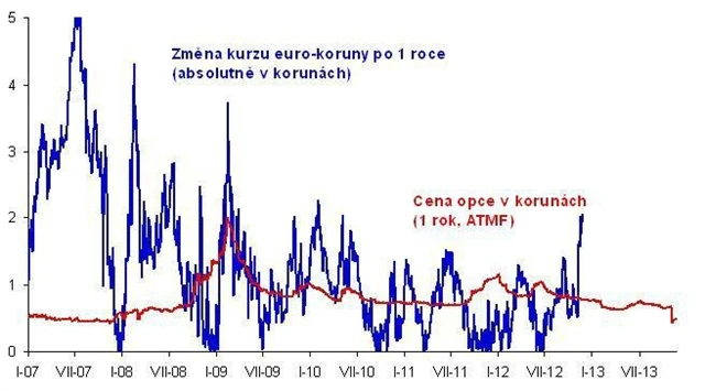 Vraťme se otázkám našich dnešních trhů – koruně a úrokům: Jak dlouho vydrží ČNB intervenovat? Několik měsíců určitě. Potom sílící ekonomika může přesvědčit většinu v Bankovní radě, že intervencí již není třeba, a koruna znovu posílí. Nebo se oživení zadrhne a ČNB odhlasuje zvýšení cílovaného kurzu euro-koruny. Nechcete-li věštit, jak se většina v Bankovní radě v průběhu 2014 rozhodne a co to udělá s euro-korunou, ale pouze si zajistit vhodný kurz, využijte měnových opcí. Ty jsou od vyhlášení intervencí levné. Tak levné byly naposledy ve 2007. Nejsou zadarmo, kurz se však často hýbe mnohem více než cena opcí, zejména je-li jejich cena nízko (graf níže).