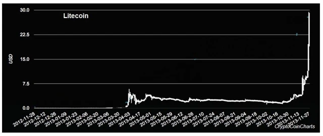 Litecoin, virtuální měna, která by měla být bitcoinem pro chudé, zažívá podobný růst jako její vzor. Za poslední týden zdražil litecoin o 400 % na 28,50 USD.