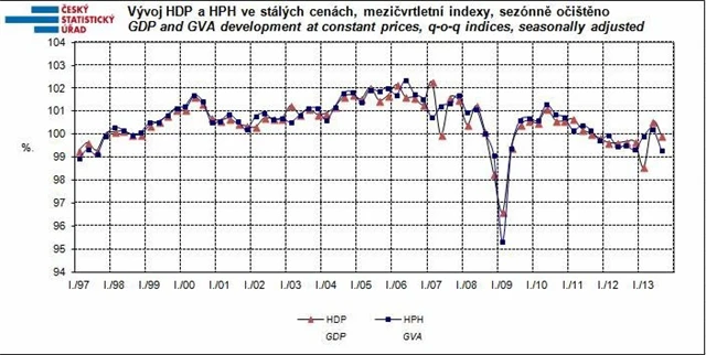 Hrubý domácí produkt podle zpřesněného odhadu klesl ve 3. čtvrtletí mezičtvrtletně o 0,1 % (původně se očekával propad o 0,5 %), meziročně o 1,3 % (původní odhad -1,6 %). Průměrná hrubá měsíční nominální mzda ve 3. čtvrtletí 2013 vzrostla na přepočtené počty zaměstnanců proti stejnému období předchozího roku o 1,3 %, reálně se zvýšila o 0,1 %. Medián mezd činil 21 331 Kč.