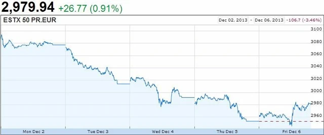 Německý DAX tak v pátek posílil o 0,96 % na 9 172,41 bodu (za týden -2,48 %), francouzský CAC 40 přidal 0,72 % na 4 129,37 bodu (za týden -3,86 %) a britský FTSE 100 narostl o 0,83 % na 6 551,99 bodu (za týden -1,48 %). Týden byl tedy pro evropské akcie hodně nepříznivý - kromě strachu z dalších kroků Fedu investory ve čtvrtek příliš nepotěšila ani ECB, která neoznámila žádná nová opatření na podporu ekonomiky a zhoršila výhled inflace a růstu HDP na rok 2014.