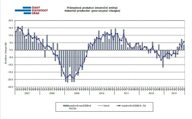 Průmyslová produkce v říjnu meziročně vzrostla reálně o 3,5 %, po očištění od vlivu počtu pracovních dnů vzrostla o 6,0 %. Ve srovnání s předchozím měsícem byla po vyloučení sezónních vlivů vyšší o 1,7 %. Hodnota nových zakázek meziročně vzrostla o 9,6 %. Stavební produkce v říjnu 2013 klesla meziročně o 1,0 %. Stavební úřady vydaly meziročně o 22,6 % stavebních povolení méně a jejich orientační hodnota klesla o 21,7 %. Bylo zahájeno meziročně o 34,4 % bytů méně. Dokončeno bylo o 16,5 % bytů méně.