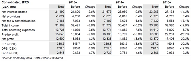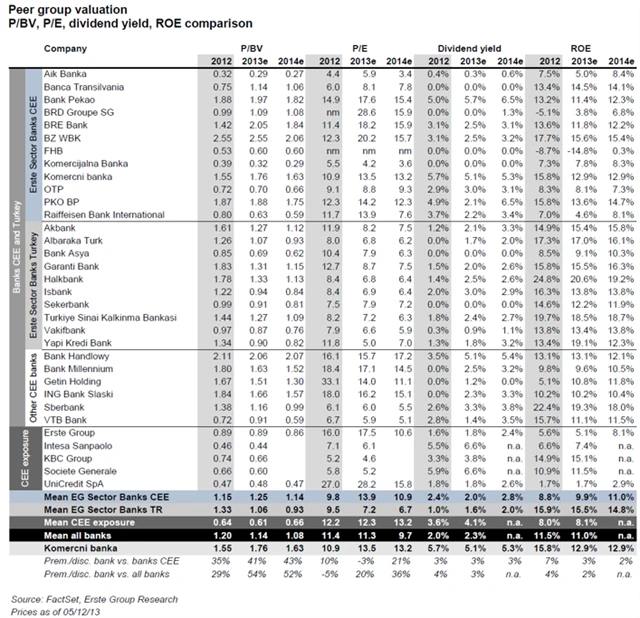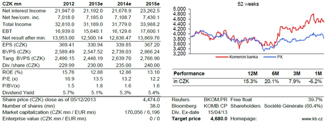 Erste v pondělí snížila doporučení na akcie Komerční banky na "držet" z "akumulovat" a zároveň upravila cílovou cenu na 4 680 Kč z 4 700 Kč. Analytici z Erste snížení odůvodňují tím, že polské banky nabízejí lepší příležitost růstu. Akcie Komerční banky si podle nich v porovnání s bankami v Polsku vedou slabě, a navíc jsou analytici opatrní, i co se týče výhledu.