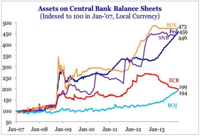 Růst cen akcií byl v roce 2013 tažen především programem odkupu dluhopisů americkou centrální bankou. Jak ale ukazuje první graf, nebyl to jen Fed, kdo tiskl peníze. I když Fed začne omezovat svou uvolněnou měnovou politiku, poteče na trhy stále hodně likvidity. Staré pravidlo "nebojujte s Fedem" tedy stále platí a mělo by se rozšířit na "nebojujte s centrálními bankami".