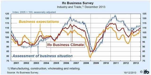 "Prosincový průzkum Ifo je v souladu s dalšími průzkumy, které naznačují, že německá ekonomika roste stabilně, avšak nenápadně," komentoval údaje ekonom z Capital Economics Jonathan Loynes. Zprávy z poslední doby mimo jiné ukázaly, že nálada investorů je na nejvyšší úrovni od dubna 2006 a důvěra spotřebitelů je nejvyšší za šest let. Soukromý sektor roste nejrychleji za osm měsíců.