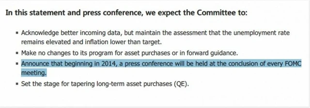 Ve své středeční predikci analytici uvedli, že neočekávají, že by Fed změnil politiku, naopak podle nich bude Ben Bernanke opět konstatovat, že míra nezaměstnanosti je stále vysoká a inflace pod cílem Fedu. Zároveň se však domnívají, že Fed přijde s novinkou a zavede pořádání tiskových konferencí po každém zasedání FOMC. Doposud byla tisková konference součástí jen několika zasedání v roce, Ben Bernanke se tak snažil o větší transparentnost politiky Fedu.