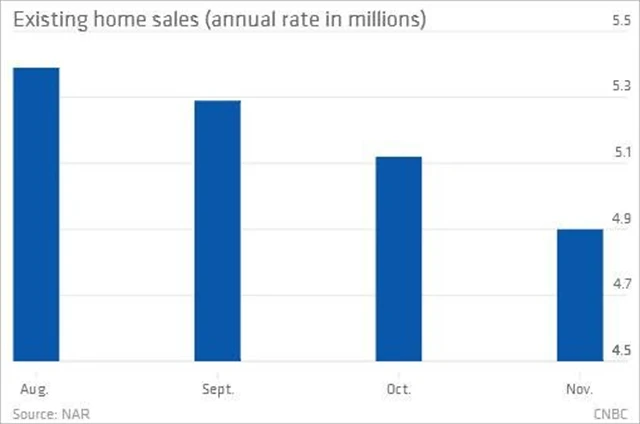 Prodejům nesvědčí růst sazeb a cen domů. V listopadu klesly prodeje stávajících domů meziměsíčně potřetí v řadě, konkrétně o 4,3 % na 4,9 milionu domů za uplynulý rok. To je nejméně od prosince 2012, analytici v anketě Reuters odhadovali 5,03 milionu prodaných existujících domů.