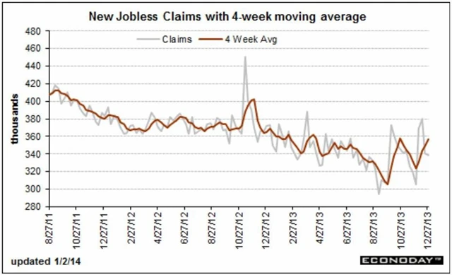 Týdenní počet nových žádostí o podporu v nezaměstnanosti ve Spojených státech v týdnu do 28. prosince 2013 klesl o 2 tisíce na měsíční minimum 339 tisíc (odhad: 344 tisíc). Předchozí týden byl revidován na 341 tisíc z 338 tisíc. Čtyřtýdenní průměr vzrostl na 357,25 tisíce z 348,75 tisíc (před revizí 348 tisíc).