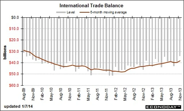 Deficit zahraničního obchodu USA v listopadu klesl na 34,3 miliardy USD z říjnových 39,3 miliardy (před revizí 40,6 miliardy USD). Analytici očekávali naopak růst na 39,9 miliardy USD.
