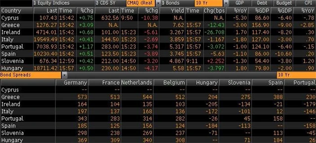 Spready (rozdíly mezi výnosy) dluhopisů zemí v eurozóně výrazně klesly - rozdíl mezi německými a španělskými dluhopisy například spadl znovu pod 200 bazických bodů. Irsko, které již opustilo záchranný program a vydalo nové dluhopisy, je zdánlivě z krize venku, nadále se však potýká s vysokým deficitem rozpočtu, stejně jako Španělsko a Řecko. Portugalsko a Řecko jsou nadále problematické, od propadu HDP přes vysoký podíl dluhu na HDP až po klesající spotřebitelské ceny.