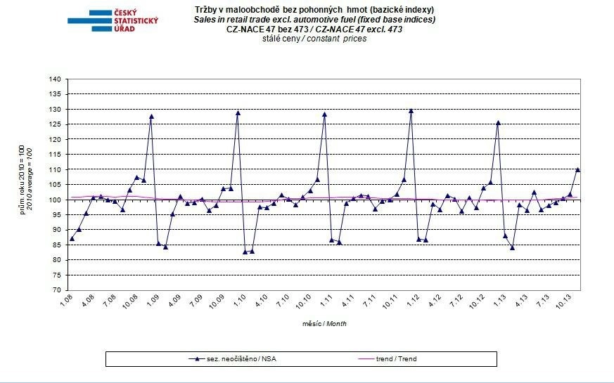 Sezónně očištěné tržby v maloobchodě včetně prodeje a oprav motorových vozidel se zvýšily v listopadu reálně meziměsíčně o 3,6 % a meziročně očištěné o vliv počtu pracovních dní o 7,8 %. Meziroční růst tržeb bez očištění o 6,1 % byl ovlivněn při nižším počtu pracovních dní (-1) růstem prodeje motorových vozidel (+3,4 p.b.), nepotravinářského zboží (+2,2 p.b.) a potravin (+0,3 p.b.), opačně působil prodej pohonných hmot (-0,2 p.b.).
