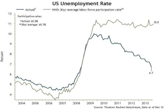 Kdyby byla takzvaná pracovní síla v USA na průměru posledních 30 let, míra nezaměstnanosti by byla nad 10 %.
